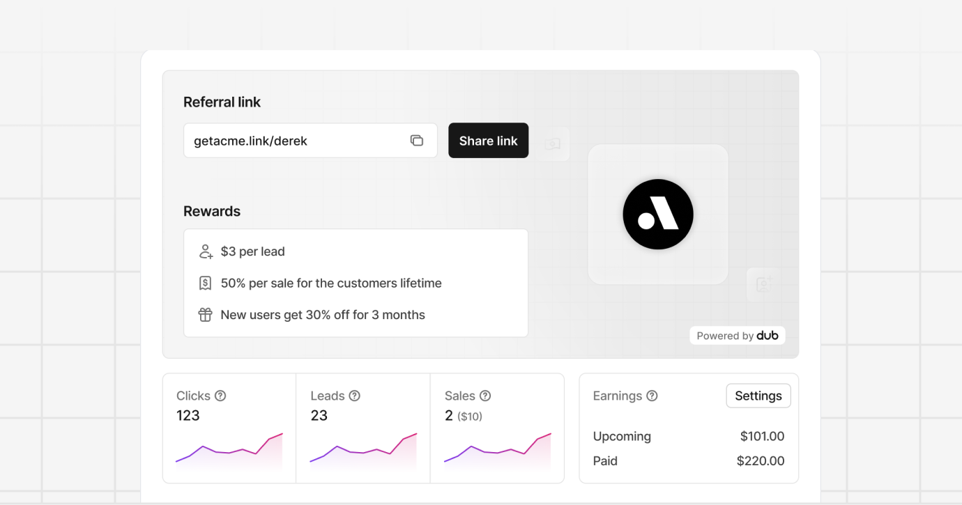 One of the unique features of Dub Partners is the ability to create an embedded referral dashboard directly inside your application.Get started
