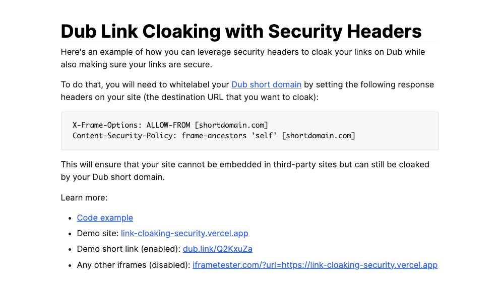 If you have control over the destination URL that you are cloaking, you can leverage security headers to enable link cloaking on Dub while also disabling iframe embedding everywhere else.Adding security headers to your destination URL
